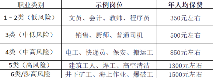 團(tuán)體意外險的保費(fèi)受職業(yè)類型影響較大,以50萬身故/傷殘保額+5萬意外醫(yī)療(不限社保)為例,市場上各職業(yè)類別的年人均保費(fèi)情況如下: